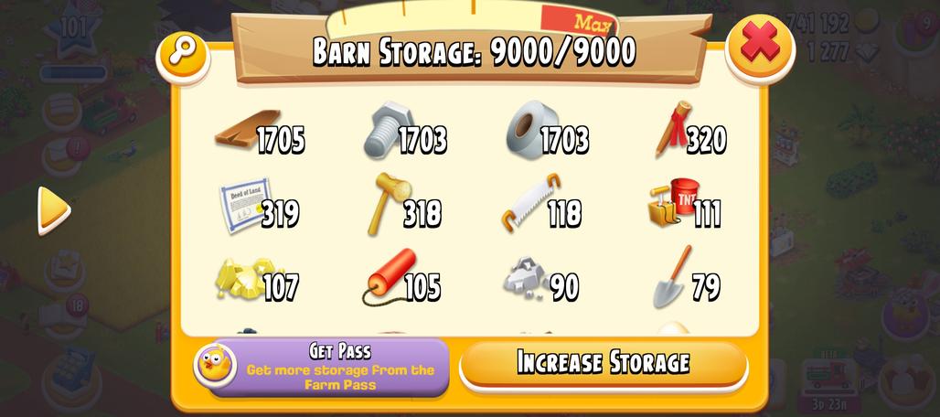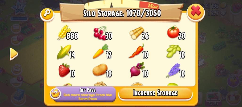 101 level | 9000 Barn Storage | 3050 Silo Storage | 14M Coin | 1200 gems | Android & IOS