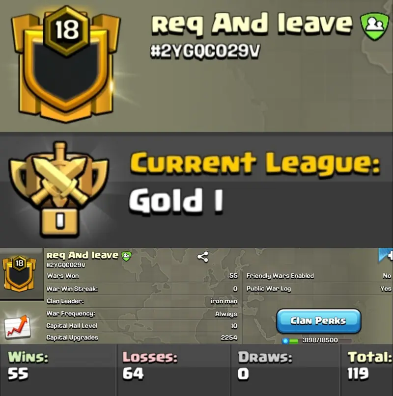 Req And leave || Level 18 clan || clan capital 10 || gold 1