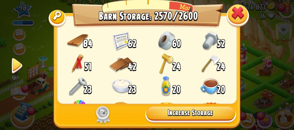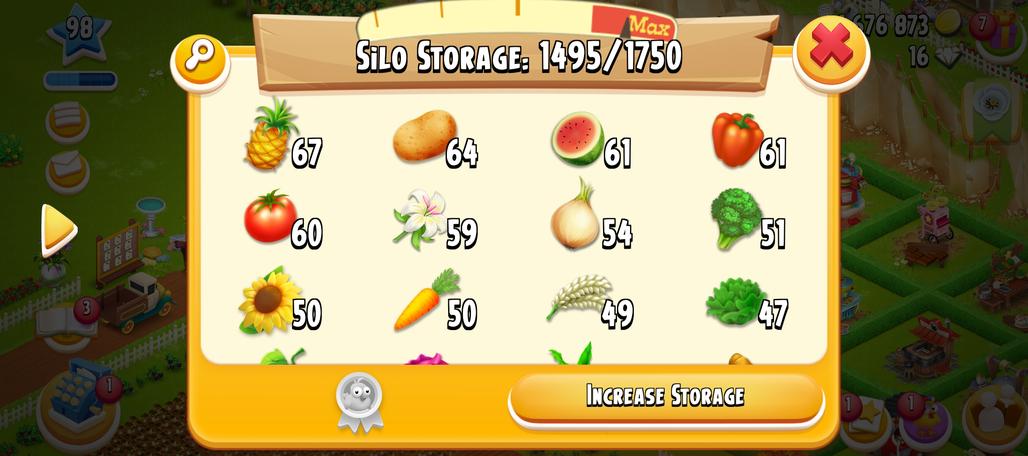 98 Level | Barn Storage 2600 | Silo Storage 1750 | 16M Coin | 16 gems | Android & ios