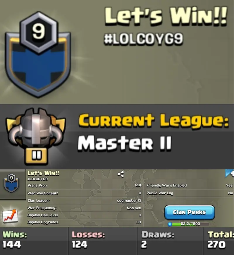 Level 9 clan || master 2 || warlog 144-124 || name - Let's Win!!