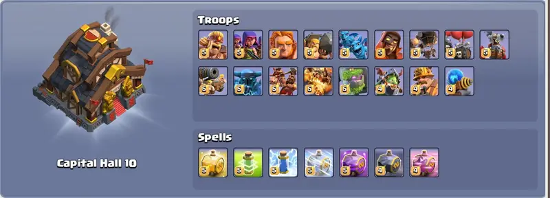 CAPITAL HALL 10 | Clan Level 19 | Name: .THE DESTROYER. | MAXED CAPITAL ARMY | Wins 126 Losses 141 | Crystal 2