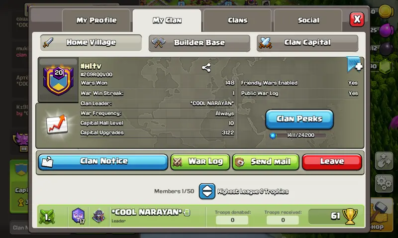 💎LEVEL 20 [] NAME: #HLTV💎 [] CAPITAL HALL 10 [] VICTORY 148 [] CWL LEAGUE: DIMOND 3 [] CAPITAL MAXED TROOPS [] INSTANT