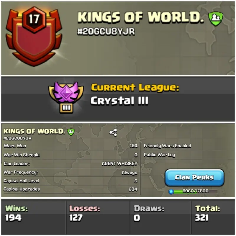 Level 17 clan || clan capital 6 || crystal 3 || warlog 194-127 || name - KINGS OF WORLD.