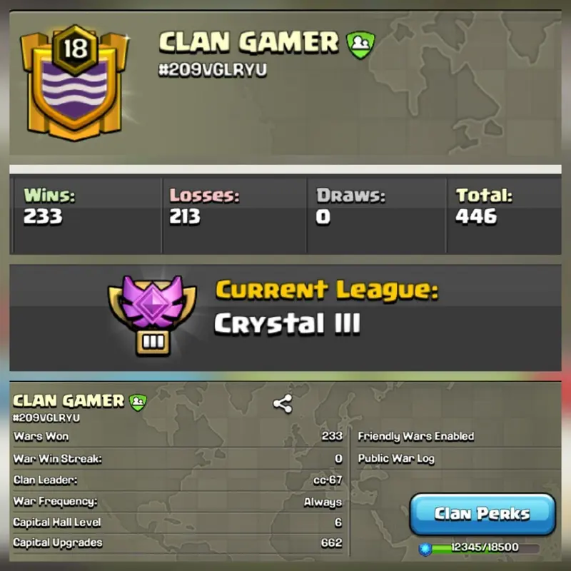 Level 18 clan || clan capital 6 || crystal 3 || name - CLAN GAMER