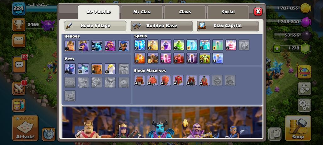 CHEAP TH14 - LVL224- HERO 74-80-55-52-30- RENAME 1000- PETS 7-6-4-5- RARE OBSTACLES - INSTANT DELIVERY - IOS - ANDROID