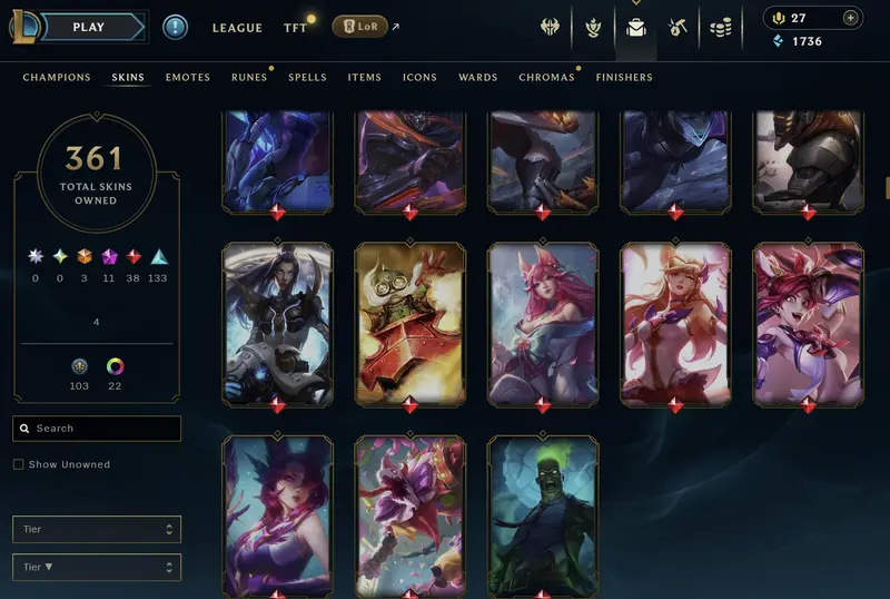 EUW | 361 skins | 160 Champions | 160 champions | DJ Sona | Pulsefire Ezreal | Spirit Guard Udyr | Dark Star Cho'Gath