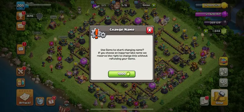 TOWNHALL 14 [] 80-80-57-55-30 HEROES [] RENAME 1000 [] AVAILABLE