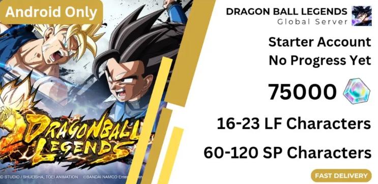 16-23 Legendary Finish characters alongside 60-120 Sparking characters. It features 75,000 Chrono Crystals and is accessible via Bandai Namco ID/ ANDROID ONLY