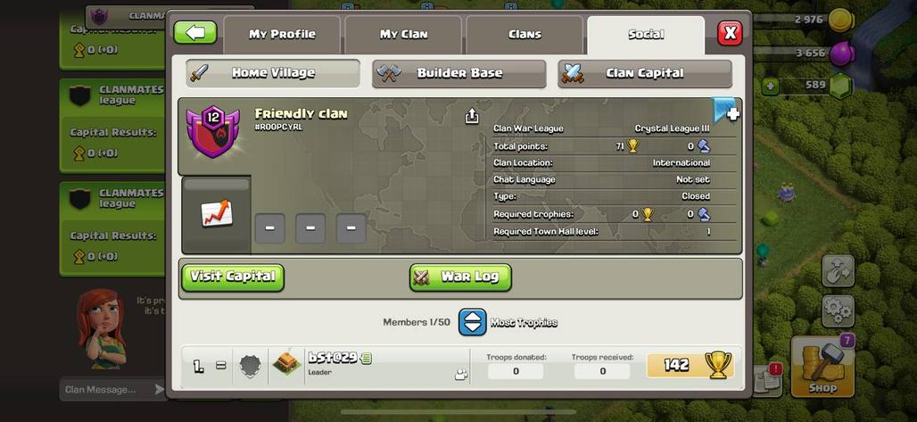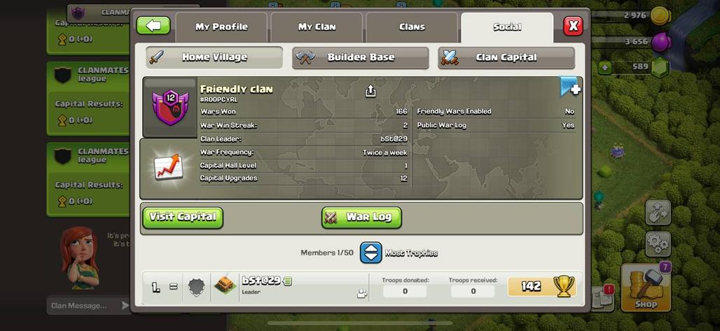 CHEAP LEVEL 12 CLAN NAME: FRIENDLY CLAN [] CAPITAL HALL: 1 [] WAR WON: 166 [] CWL: CRYSTAL 3