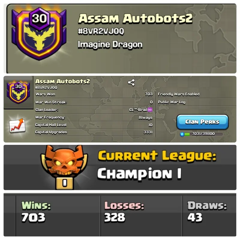 LvL : 30 !! Assam Autobots2 !! Champions 1 !! Rare 703 Win 328 Loss !! Clan Capital 10 Full Max !! Perks 7000:39800 !!