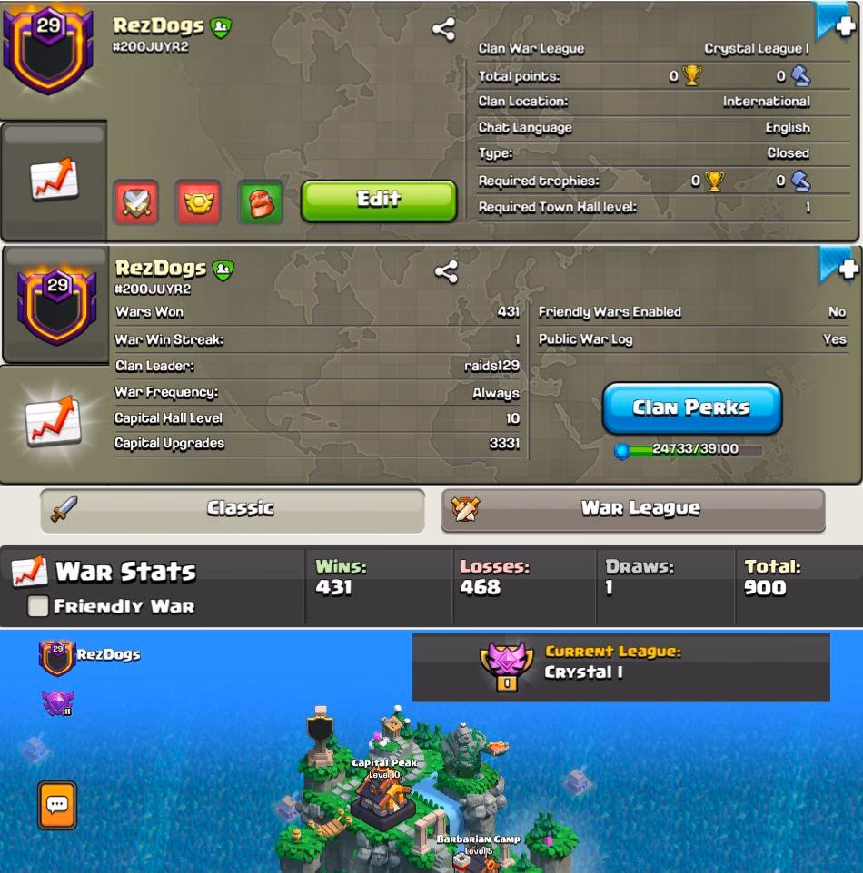 UNIQUE NAME CLAN LVL 23 BATTLETHRONE CRYSTAL LEAGUE LVL 8 CAPITAL