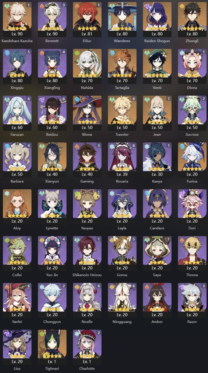 NA AR 59 13 + 1 Leg | Kazuha C1 | Wanderer | Zhongli | Raiden | Tartaglia | Venti | Nahida | Xianyun | Furina | Tighnari