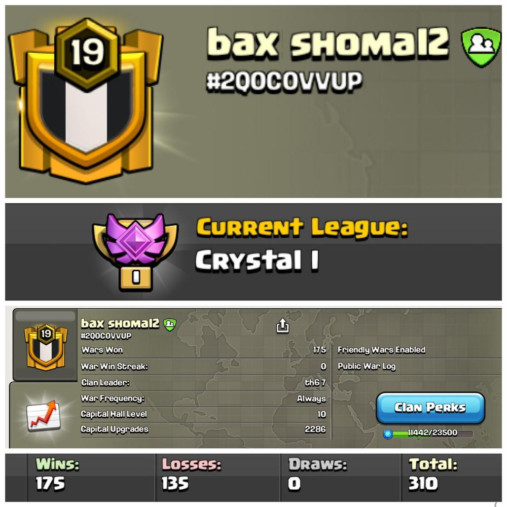 NAME- bax shomal2 | LVL 19| WARLOG W-L-D:175-135-0 | CWL League: CRYSTAL 1| CC: 10!!