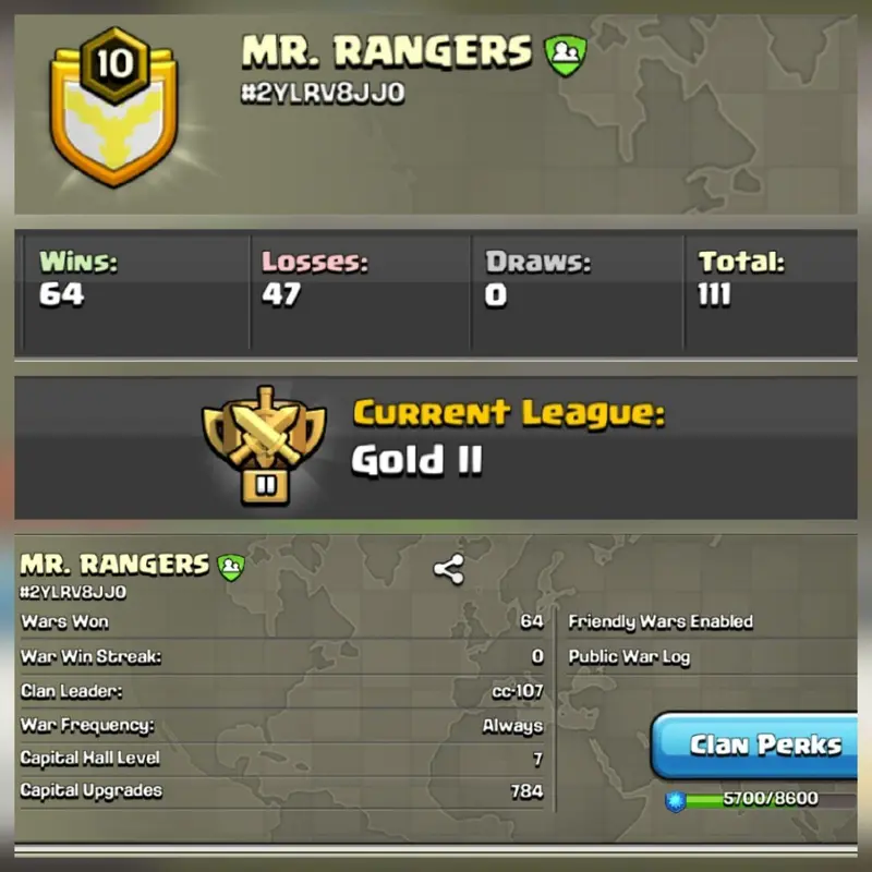 Level 10 clan || clan capital 7 || gold 2 || name - MR. RANGERS