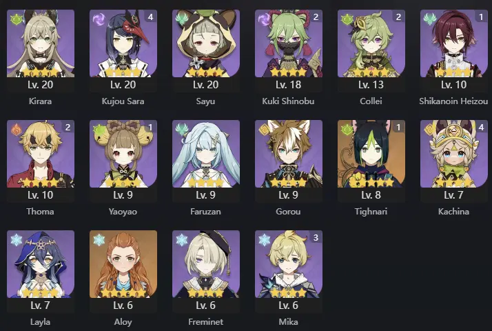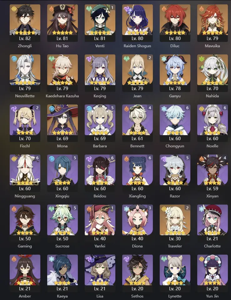 NA | AR 60 | 14 3 Leg | Venti C1 | Tighnari C1 | Zhongli | Hu Tao | Raiden | Neuvillette | Kazuha | Mavuika | Ganyu |